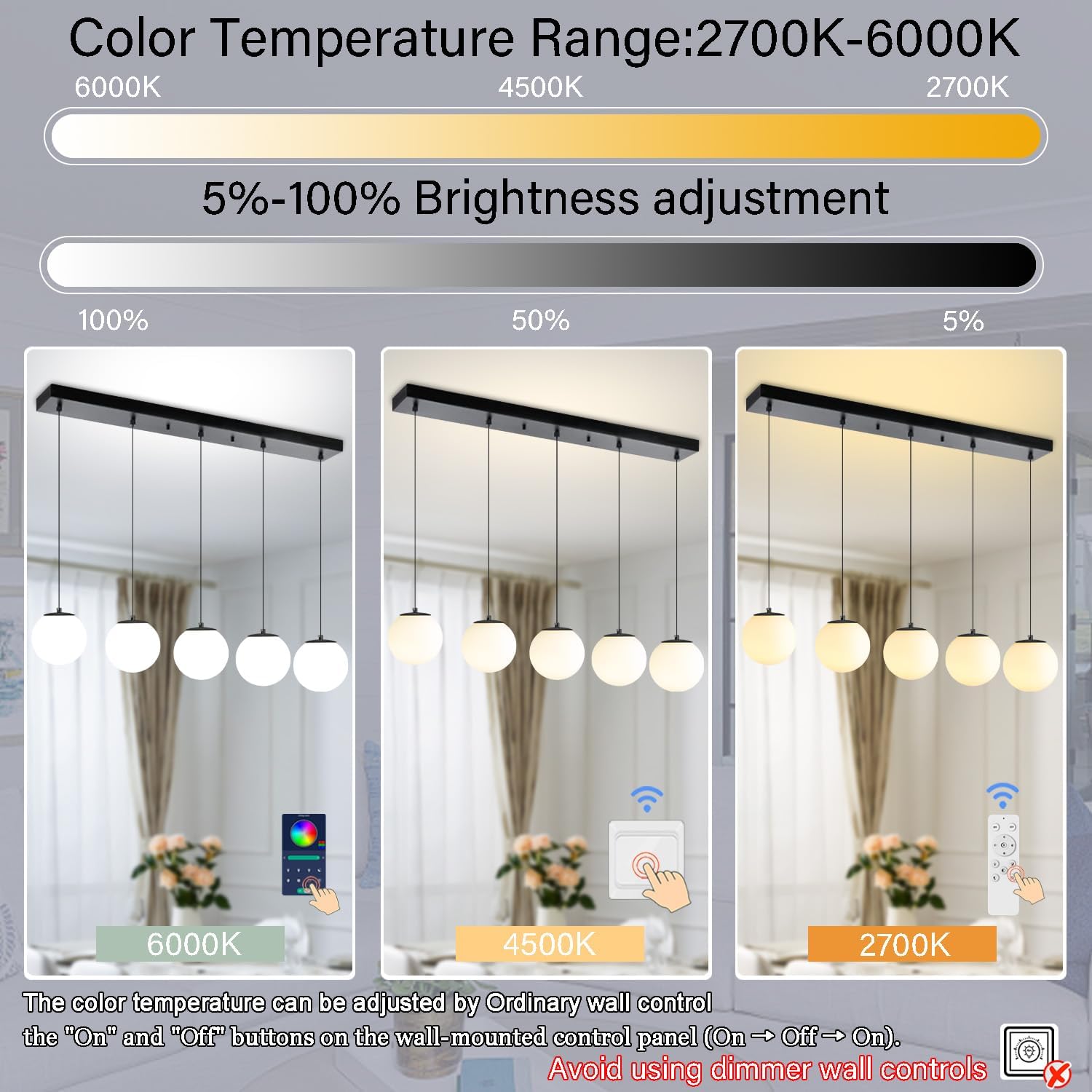 - 【Smart LED Linear Chandelier 】It is equipped with a remote control and APP control for seamless dimming between warm white (2700K) and cold white (6000K), as well as adjustable brightness ranging from 5 to 100 percent.