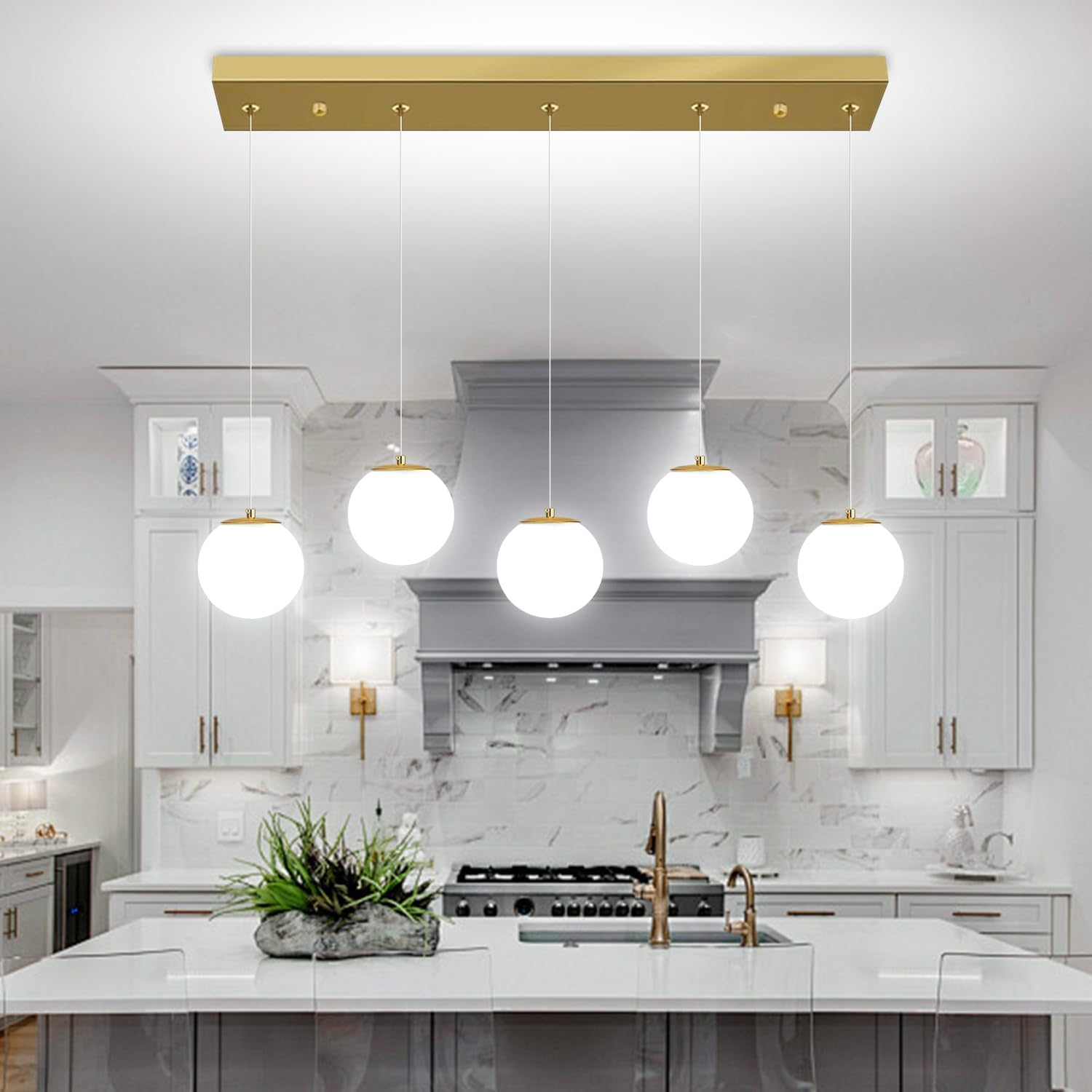 5-Lights Globe Pendant Light for Kitchen Island H 98" Gold Rectangle Chandelier Milk White Glass Pendant Lighting for Living Room Bedroom Entryway