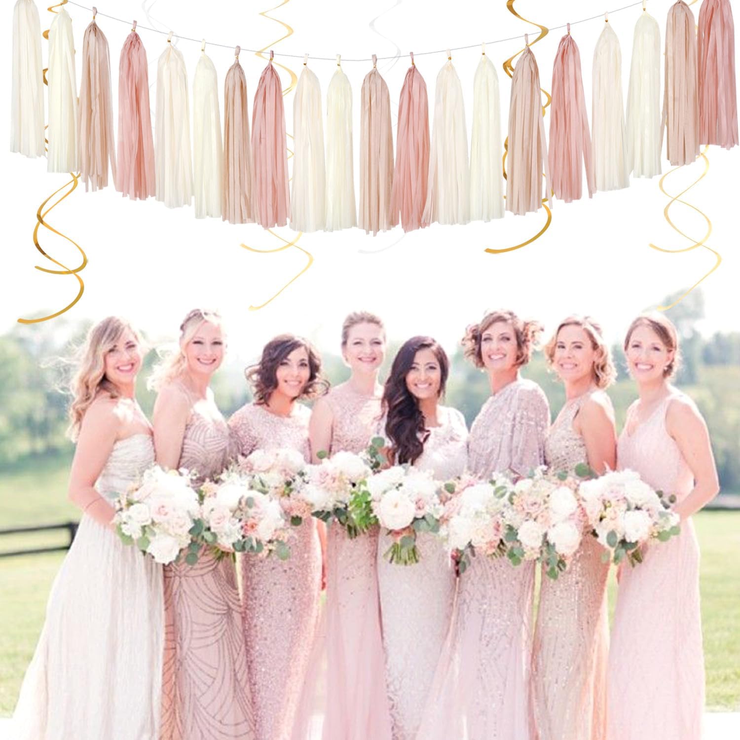 - 【Garland includes】20tassels in champagen gold beige ivory blush pink color. Each tassel is about 14" long after assembled. And each garland comes with a 10ft long free String for hanging these tassels.