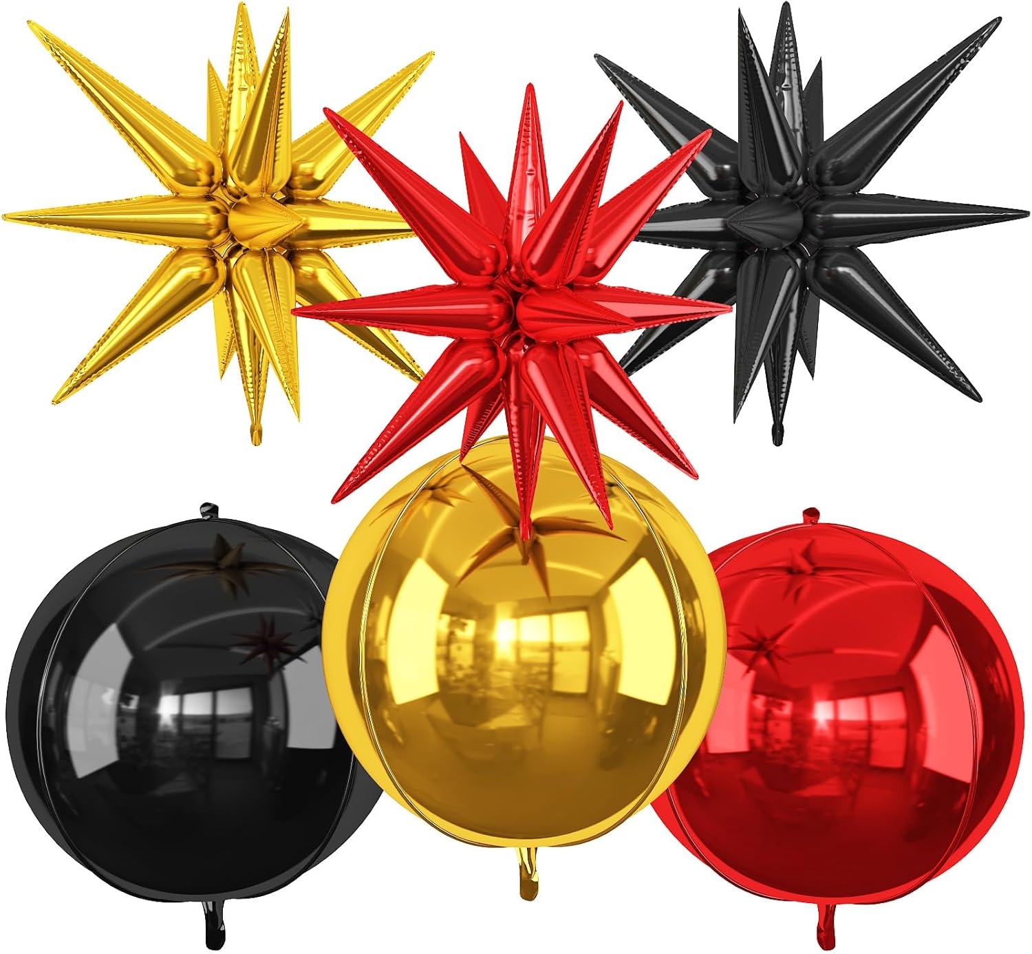 - 【Package】The package includes 3pcs 22Inch 4D ball foil balloons(black x 1,red x 1,gold x 1),3pcs 22Inch star foil balloons(black x 1,red x 1,gold x 1),and ribbon.These huge balloons can help you decorate your party better.