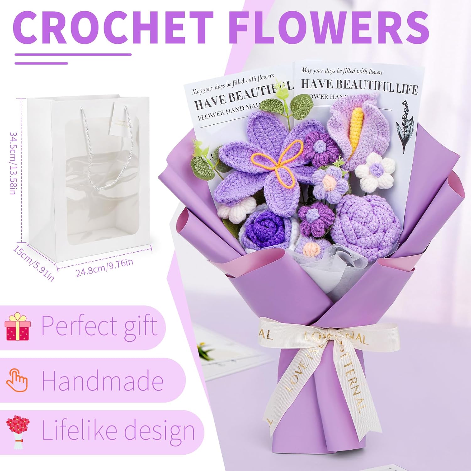 - High-Quality Materials: Each crochet flower is carefully crocheted with high-quality milk cotton yarn, which is soft and skin-friendly, with a delicate and gentle touch. Paired with exquisite high-end packaging gift bags, from the details to the overall design, it highlights the craftsmanship and style, giving every companionship and blessing a gentle and lasting sense of ritual.