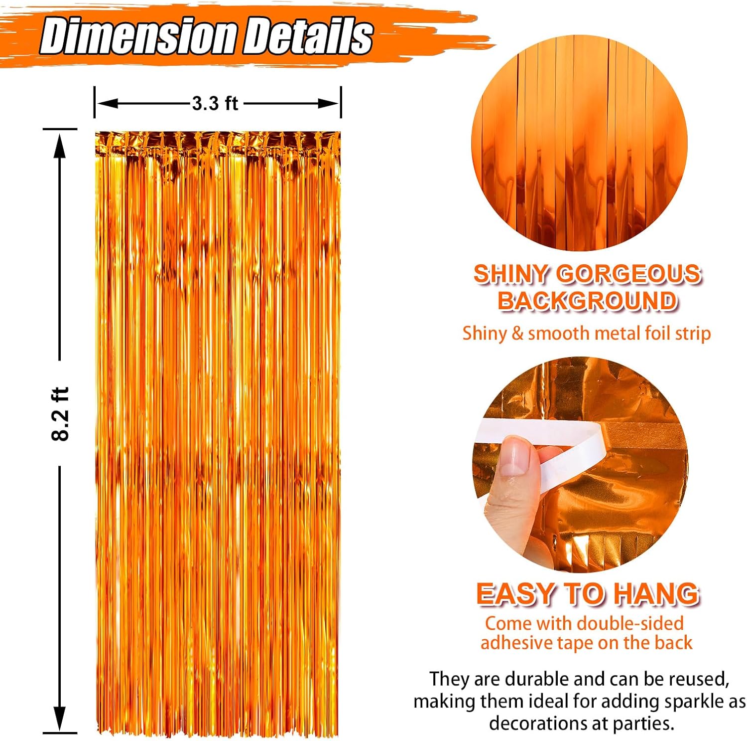 - Easy to Use - The foil curtain backdrop comes with double sided tape on the top, peel plastic strip off and it would be very easy to paste on smooth surfaces such as wall, window, table, door or anywhere you like. You can cut the foil curtain with scissors into the suitable Length, assemble the party streamers side by side to make the backdrop larger, or layer the backdrop curtains to get a thicker effect.