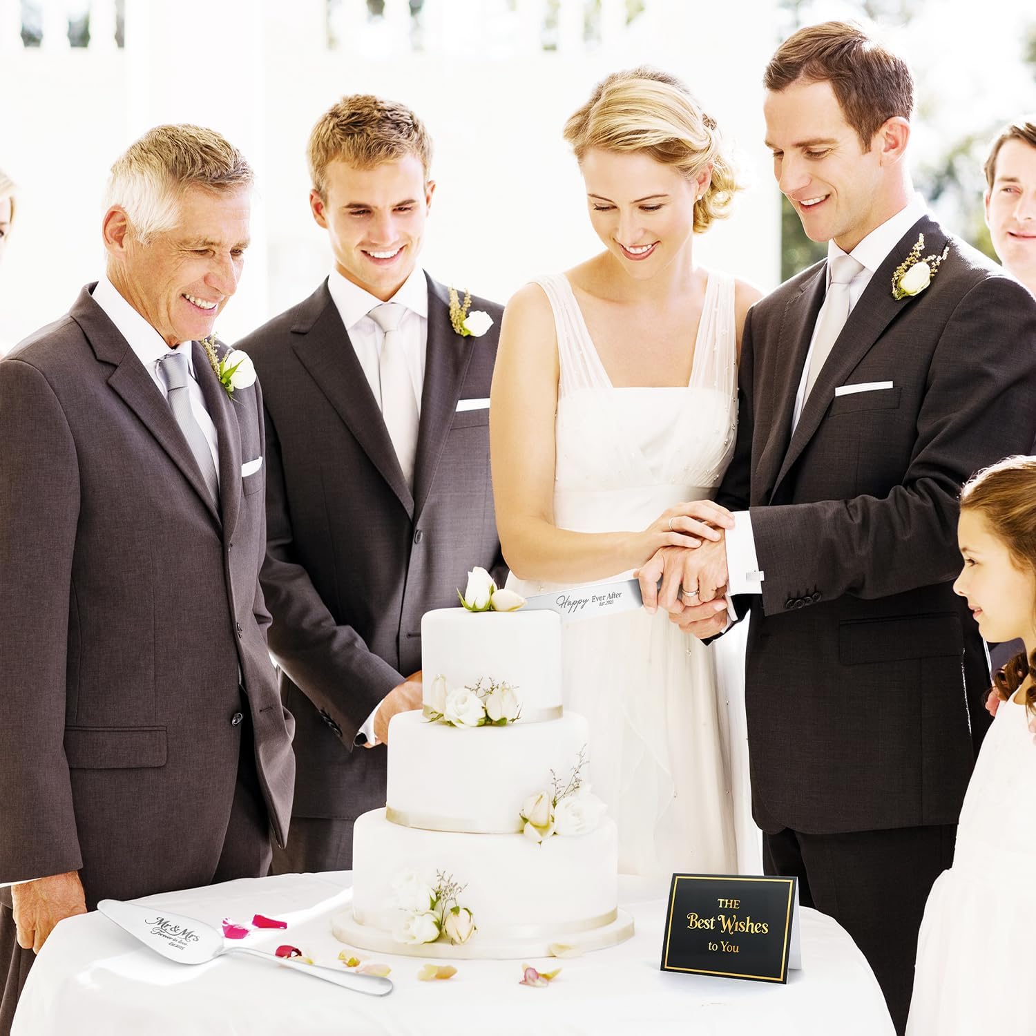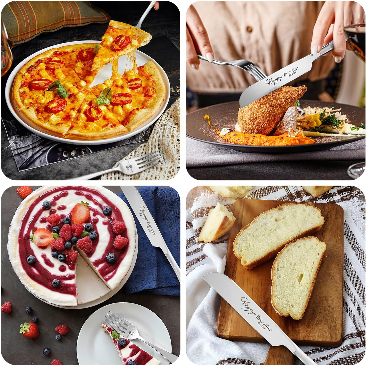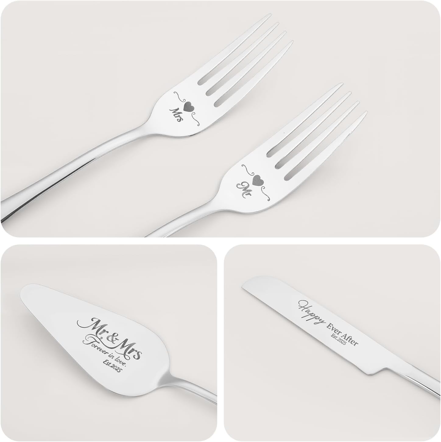 - 【Designed for Weddings】This wedding cake knife and server set includes a tray engraved with “Mr & Mrs Forever in Love Est.2025”, a cake knife with “Happy Ever After”, and two forks engraved with “Mr” and “Mrs.” The set comes in a premium gift box with the Forever in Love Est.2025 theme. Its elegant design brings charm to your special day and symbolizes a new journey of happiness together."