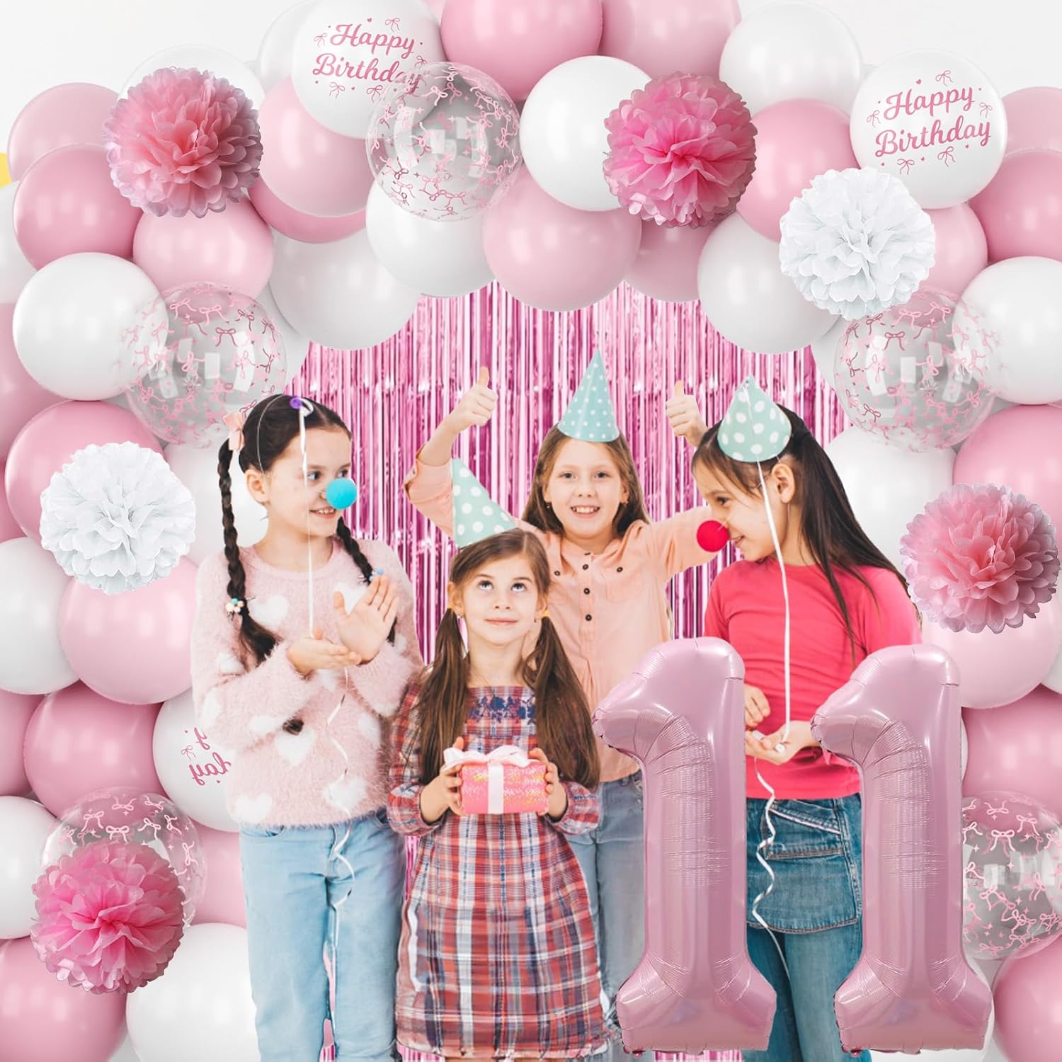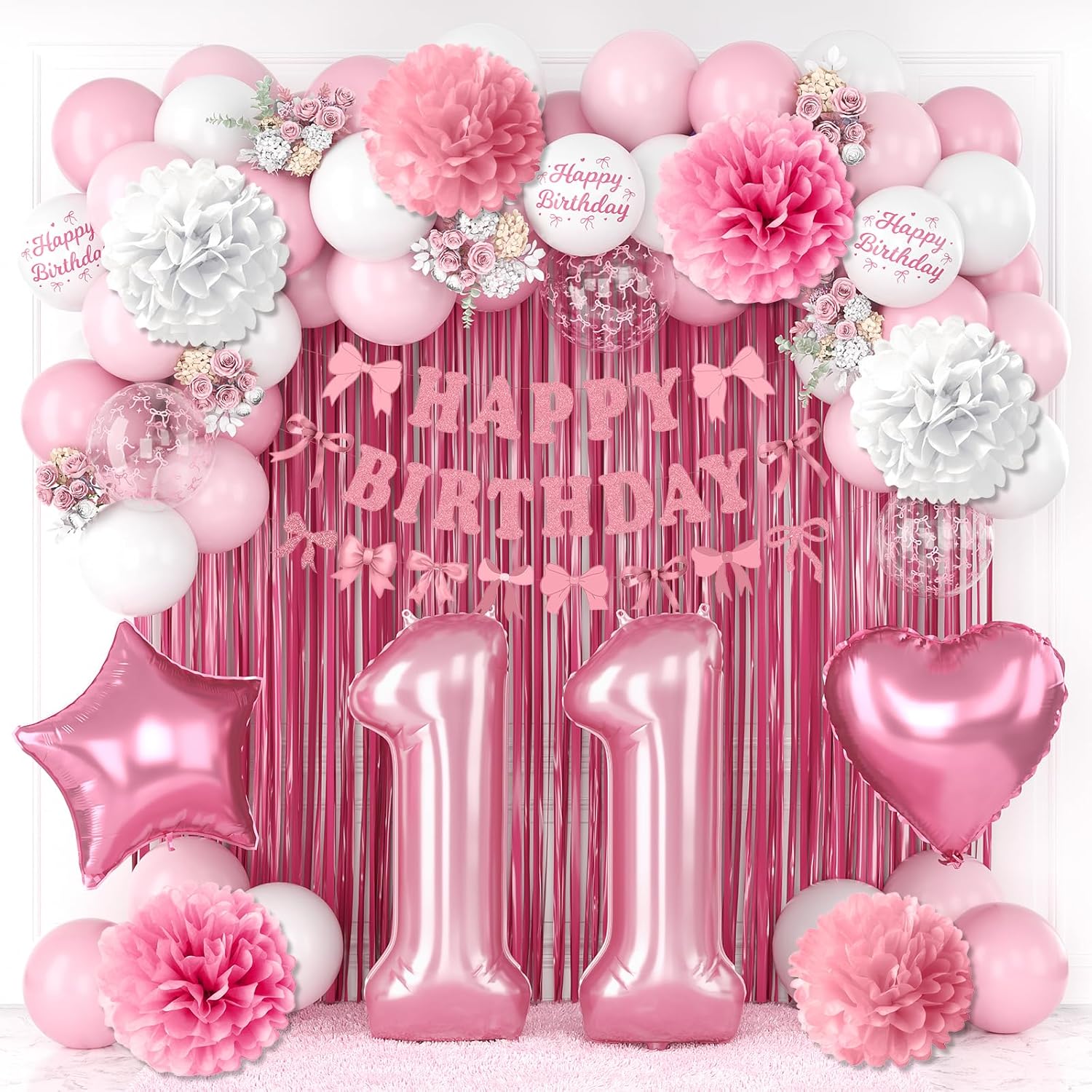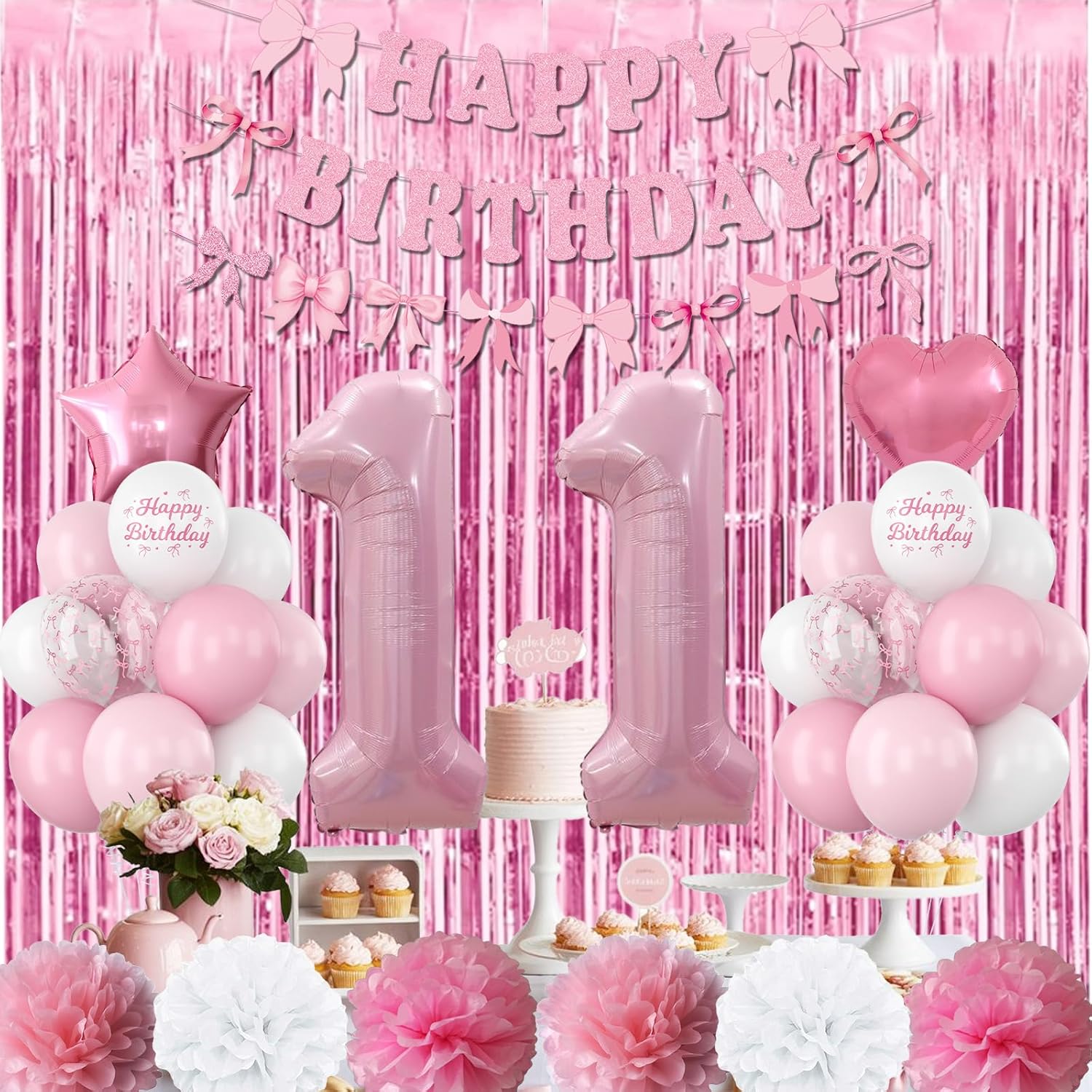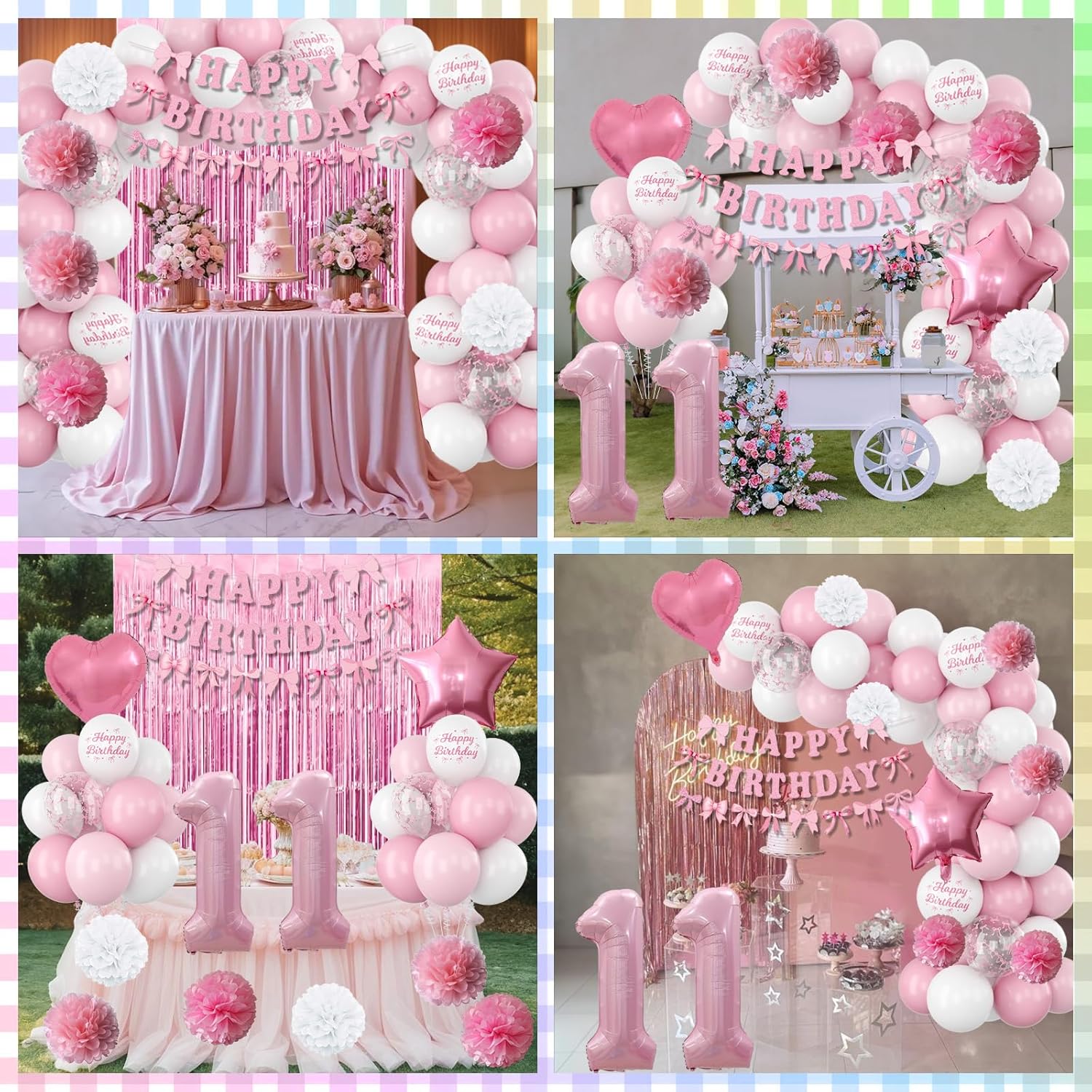 - PACKAGE INCLUDES: 1pc pearl pink number 11 balloon, 1pc bow happy birthday banner, 2pcs pink paper pom poms, 2pcs light pink paper pom poms, 2pcs white paper pom poms, 1pc pink curtain, 1pc light pink star foil balloons, 1pc light pink heart foil balloons,6pcs light pink balloons, 6pcs pastel pink balloons, 4pcs white balloons, 2pcs birthday printed balloons, 2pcs bow clear balloons, 1pc ribbon