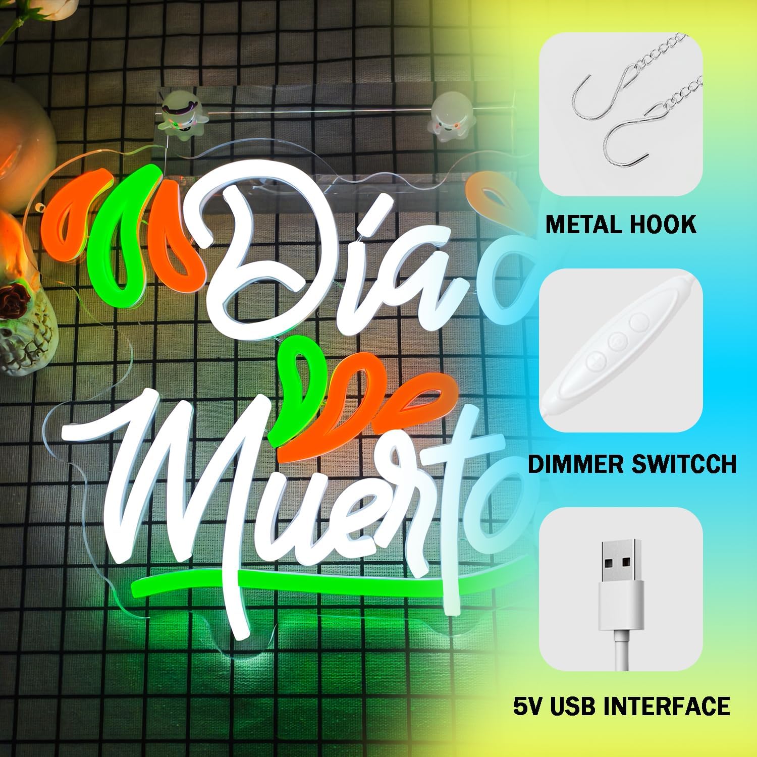 - 【USB Powered】This Day of the Dead decoration neon sign features a durable metal hanging chain with a standard USB port, compatible with power banks, laptops, and USB wall plugs. No need for hassle-free installation; simply hang it up and plug it in to create a vibrant atmosphere. The lightweight design makes it easy to mount on walls, windows, or doors, making it a perfect decoration for Day of the Dead parties, instantly adding a festive touch to your space!