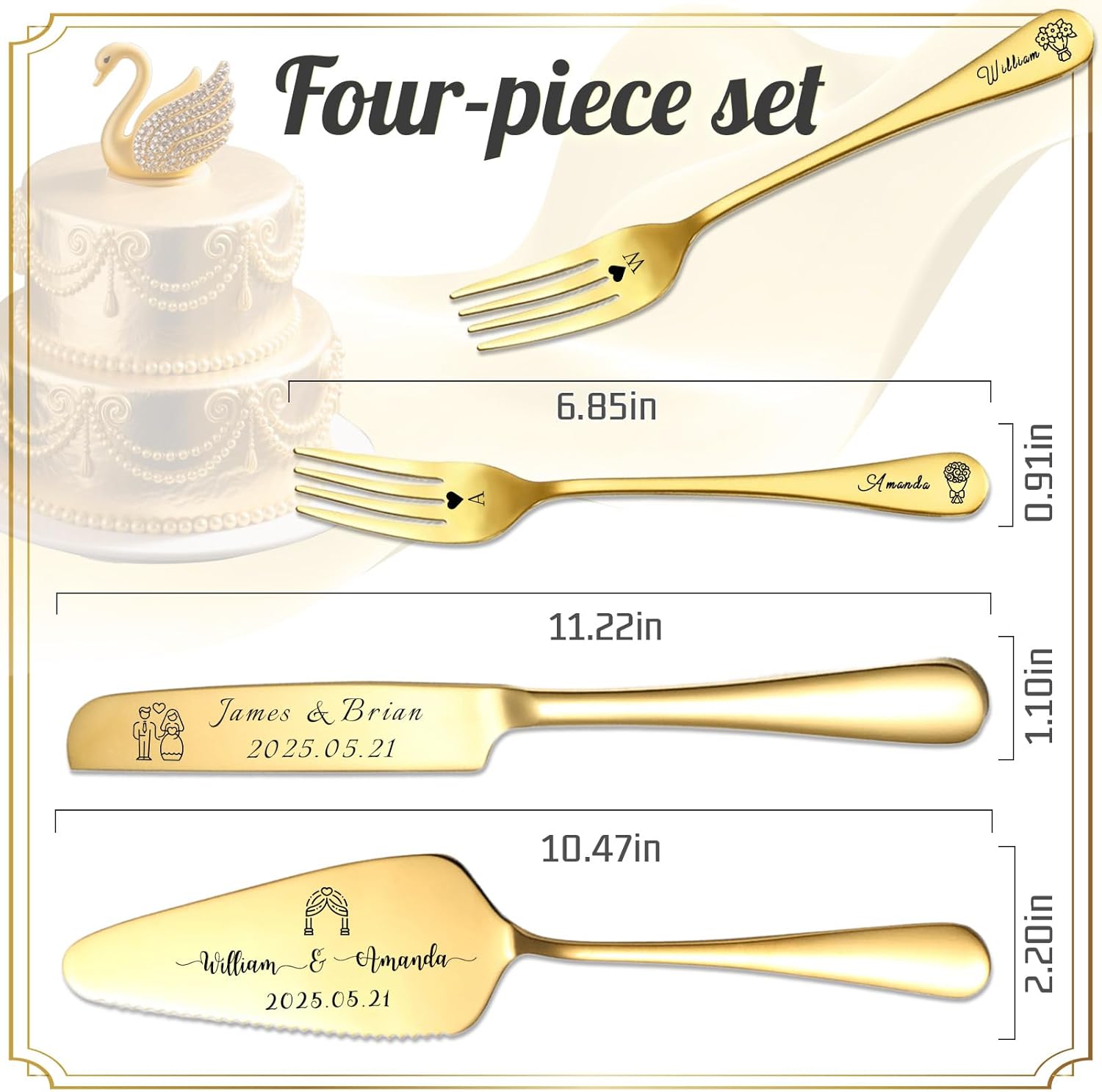 Custom Wedding Cake Knife and Server Set Personalized Cake Cutter with Engraved Text Bridal Cake Cutting Set with Gift Box for Weddings Anniversary Birthday (Gold - with fork)