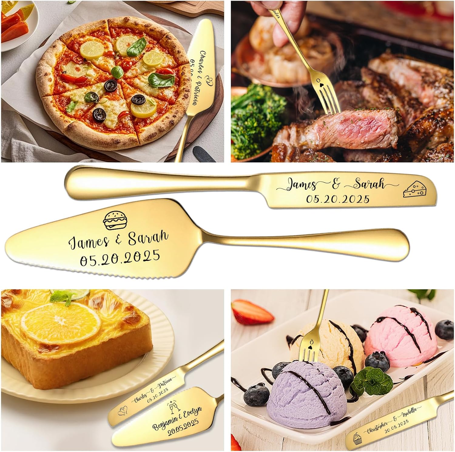 - Cake Knife and Server Set: The personalized cake cutting set adopts a multifunctional design and is also suitable for daily use. Its wavy blade with a triangular shovel surface can not only neatly cut out multi-layered desserts, but also firmly hold up block-shaped food. Whether it is a wedding cake, fruit pie, pizza, pancakes, omelets, etc., it can make every meal full of ritual