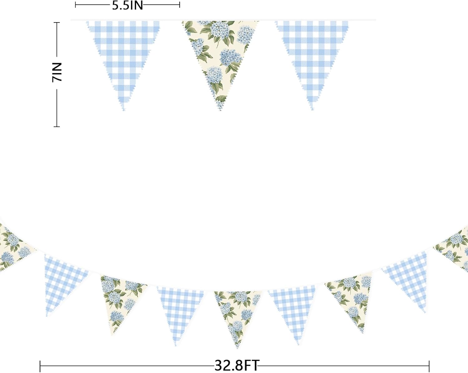 - Package Including:1 pack blue gingham vintage floral fabric bunting banner garland in blue gingham and vintage blue hydrangea print colors, with 36pcs flags in 10M/32.8Feet. Flag Size: 5.5in width x 7in height.