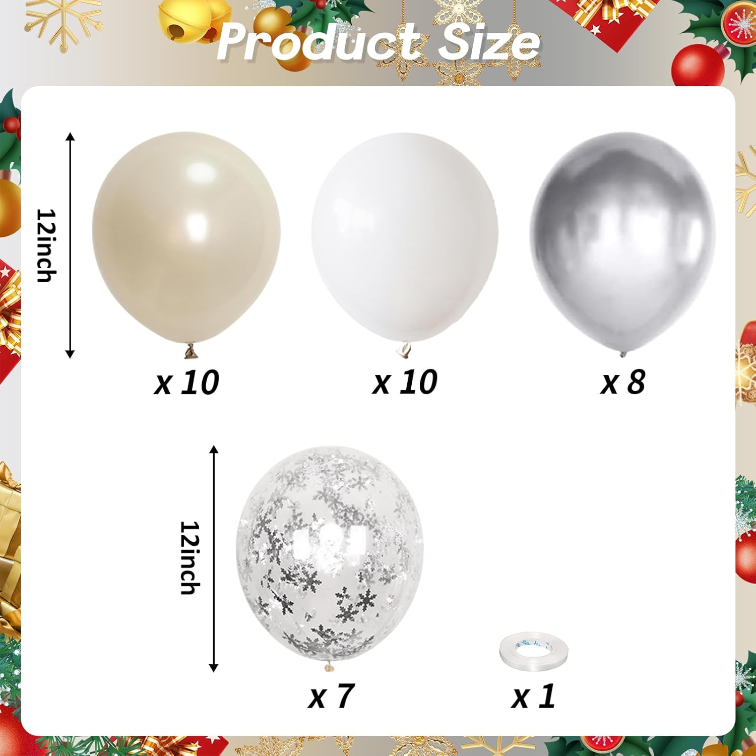 - Party Balloons Set: The pearl white and silver winter wonderland balloons set have 35pcs 12inch helium balloons, include 10pcs pearl white sand balloons, 10pcs white balloons, 8pcs metallic chrome silver balloons, 7pcs snowflakes confetti balloons. The set comes with 1pc balloon ribbon to help you easily build balloon garland or arch.