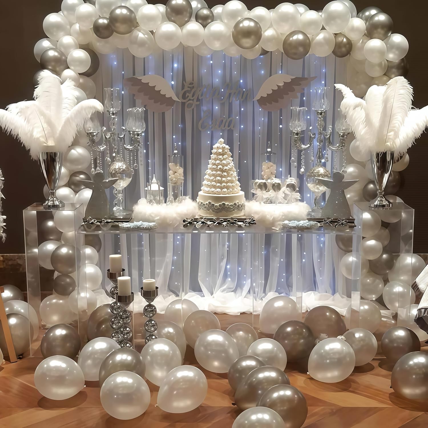 - Multiple creative uses: Our pearl white and silver balloon kit is perfectly color coordinated, making it easy to create balloon arches, balloon garlands, balloon bouquets, balloon columns, table centerpieces, or photo booth backdrops. Great for decorating baby shower entrances, winter wonderland themed party walls, cake tables, and Christmas party backgrounds. TIPS: Use 2 or more packs for a fuller display!