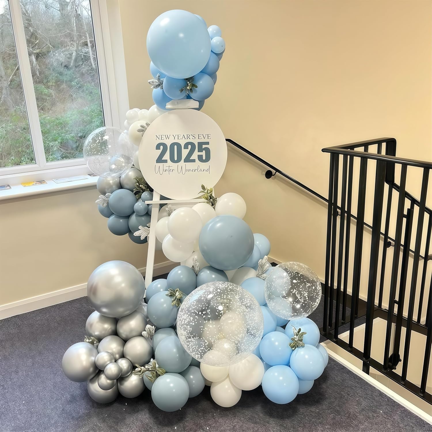 - Party Balloons Set: The winter wonderland balloons set have 60pcs 12inch helium balloons, include 13pcs ice blue balloons, 13pcs light blue balloons, 12pcs white balloons, 8pcs chrome metallic silver balloons, 7pcs metallic chrome silver confetti balloons, 7pcs clear snow balloons, and 2pcs white balloon ribbon.