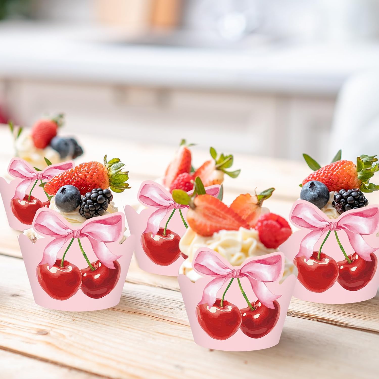 - CHERRY DESIGN: Our cupcake wrappers feature cute pink bowknots and red cherry prints, adding a sweet, feminine touch to desserts, perfect for creating an eye-catching display at any occasion