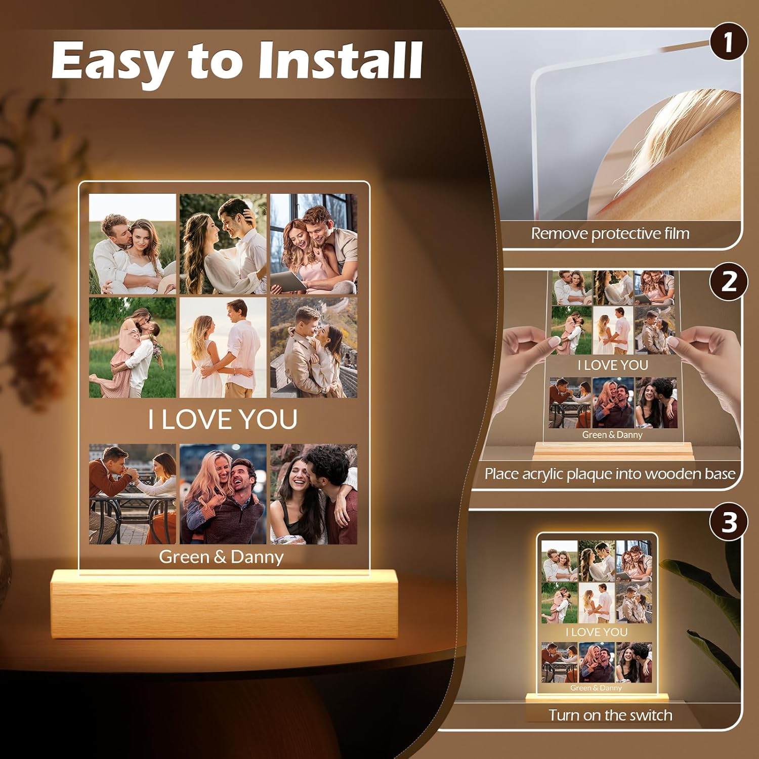 - Personalized Photo Frame with Night Light: Simply upload your favorite photos and add custom text to create a unique acrylic photo plaque with an integrated night light. This artistic display beautifully showcases your precious memories, adding a touch of romance and meaning to any space.