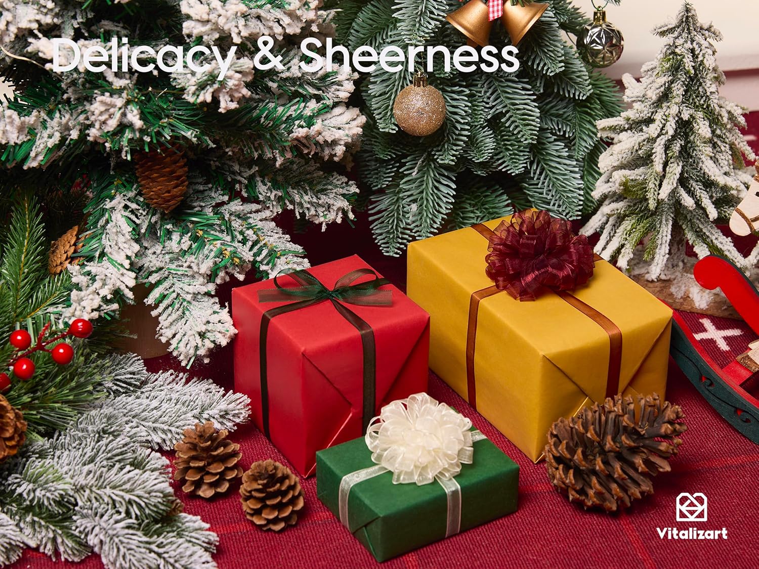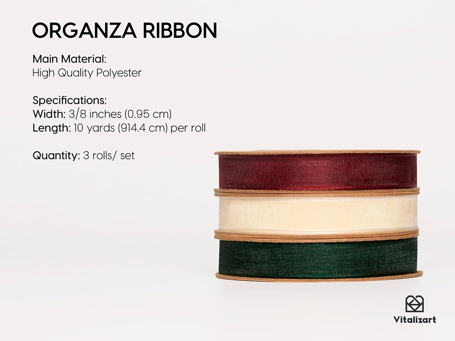 Vitalizart 3/8" x 30Yd Organza Ribbon Christmas Sheer Ribbons Set 10 Yd x 3 Rolls Red Green White Handmade Eco-Friendly for Christmas Gift Wrapping Tree Decor Bows Wreaths