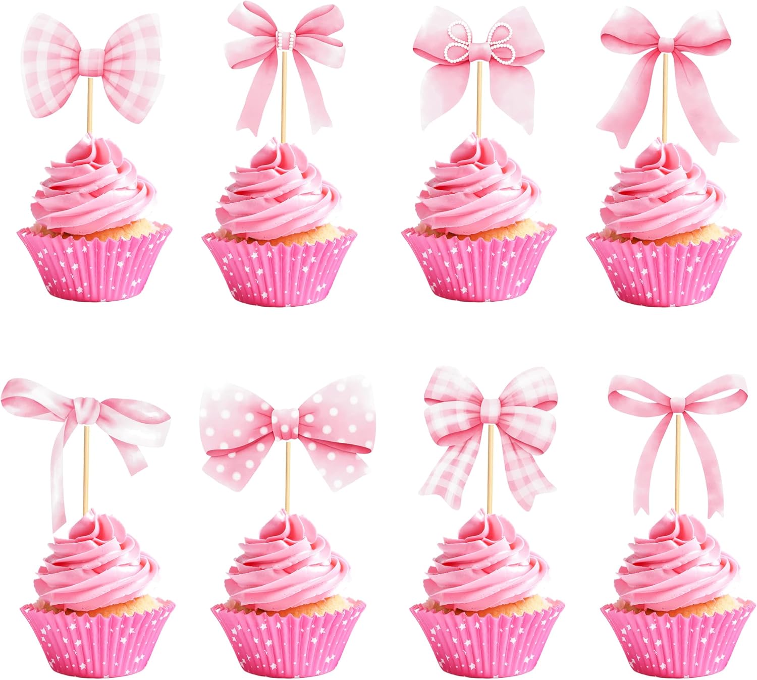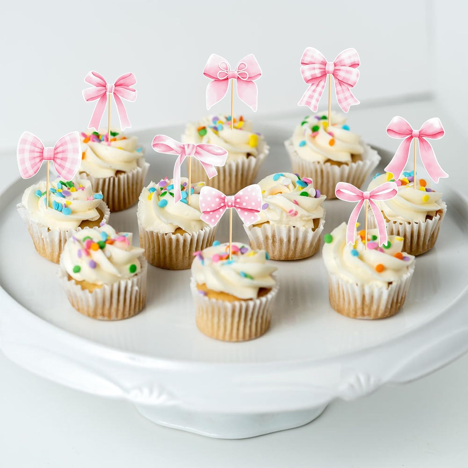 24pcs Coquette Bow Cupcake Toppers Pink Bow Coquette Birthday Cake Decorations for Bachelorette Bridal Engagement Wedding Girl Baby Shower Bow Theme Party Decor