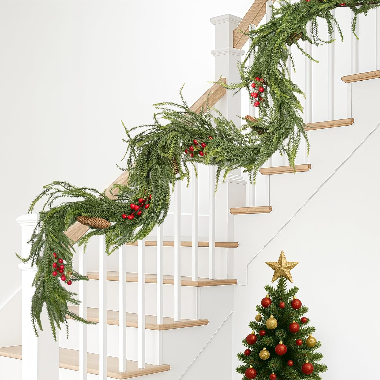 - UNIQUE, LUSH MIX: Norfolk pine garland layered with pine & cedar (cypress) tips and red berries for a rich, dimensional look. Measures 9 ft (108 in) in length; garland only—no lights included.