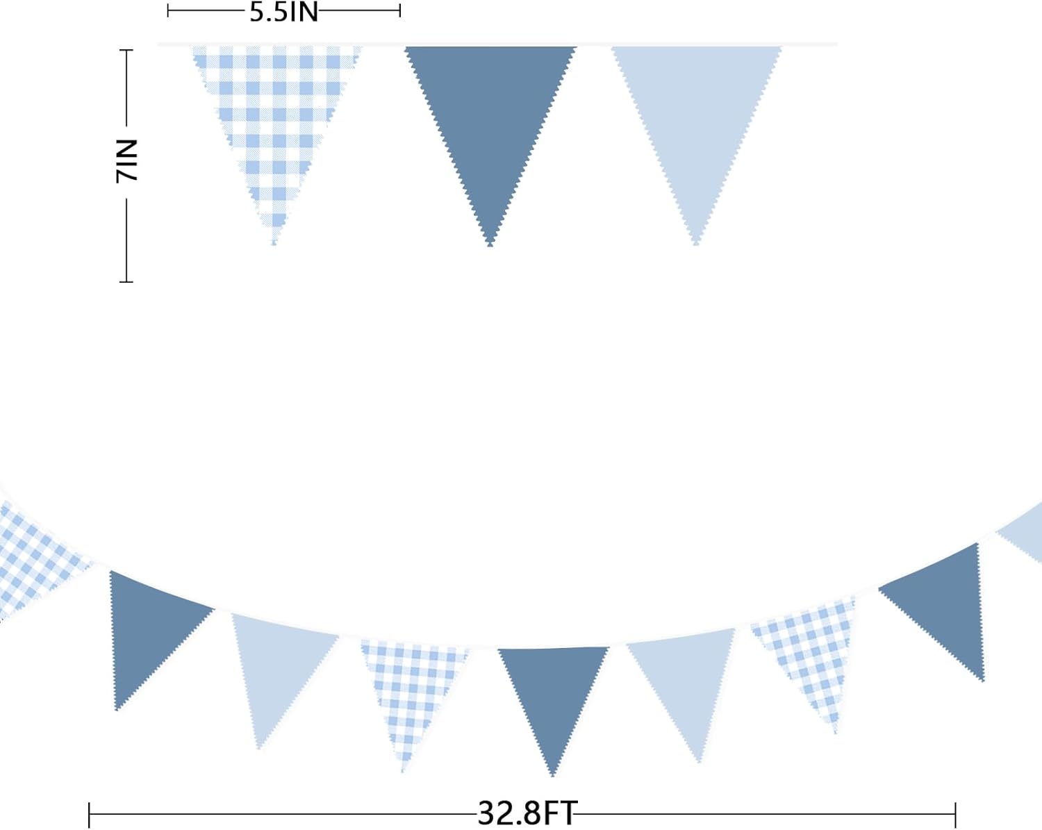 - Package Including:1 pack dusty blue gingham fabric bunting banner garland in dusty blue, light blue and blue gingham colors, with 36pcs flags in 10M/32.8Feet. Flag Size: 5.5in width x 7in height