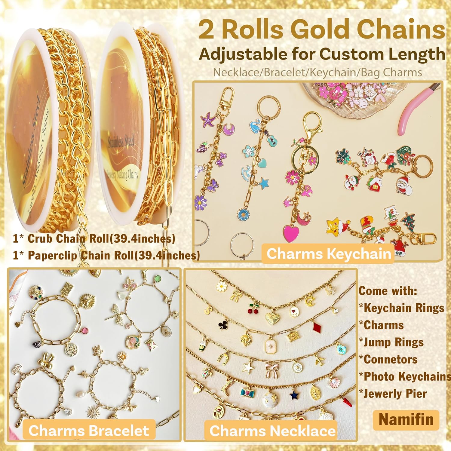 - COMPLETE 384 PCS DIY KEYCHAIN KIT – Includes 112 gold charms (letters, flowers, fruit), 30 keychain clips in 3 styles with rings, 30 lobster clasps, 200 jump rings in 3 sizes (6/7/8mm), 2 rolls of extender chains (65.6 ft total), 1 pink jewelry plier, and 6 photo keychains – all the essentials for creative crafting