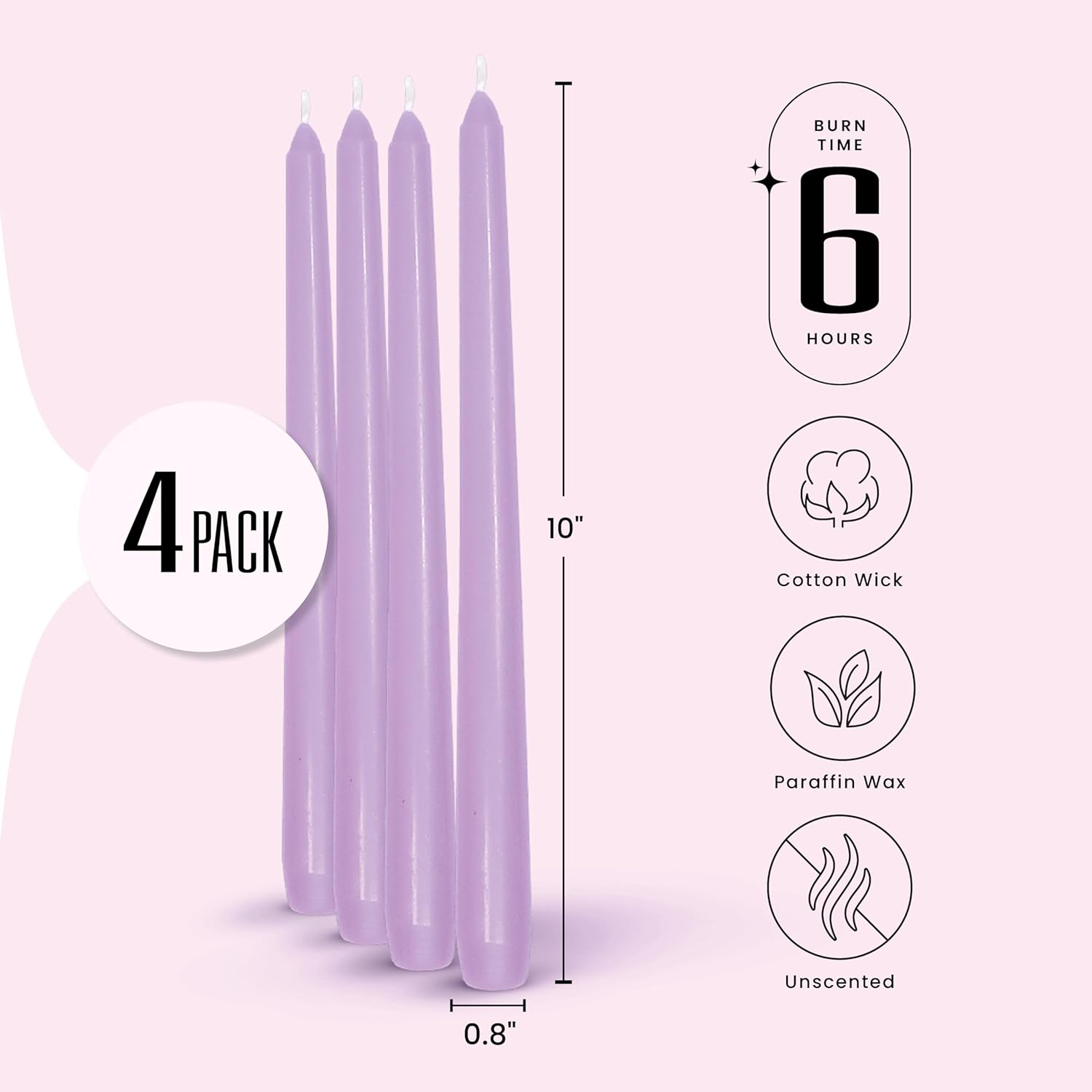 Leor & Lair Light Purple Candlesticks - 4 Pack 10" Long Candles - Unscented Long Burning Purple Candles for Easter, Bridal Showers, Spring Weddings, Restaurants & Events