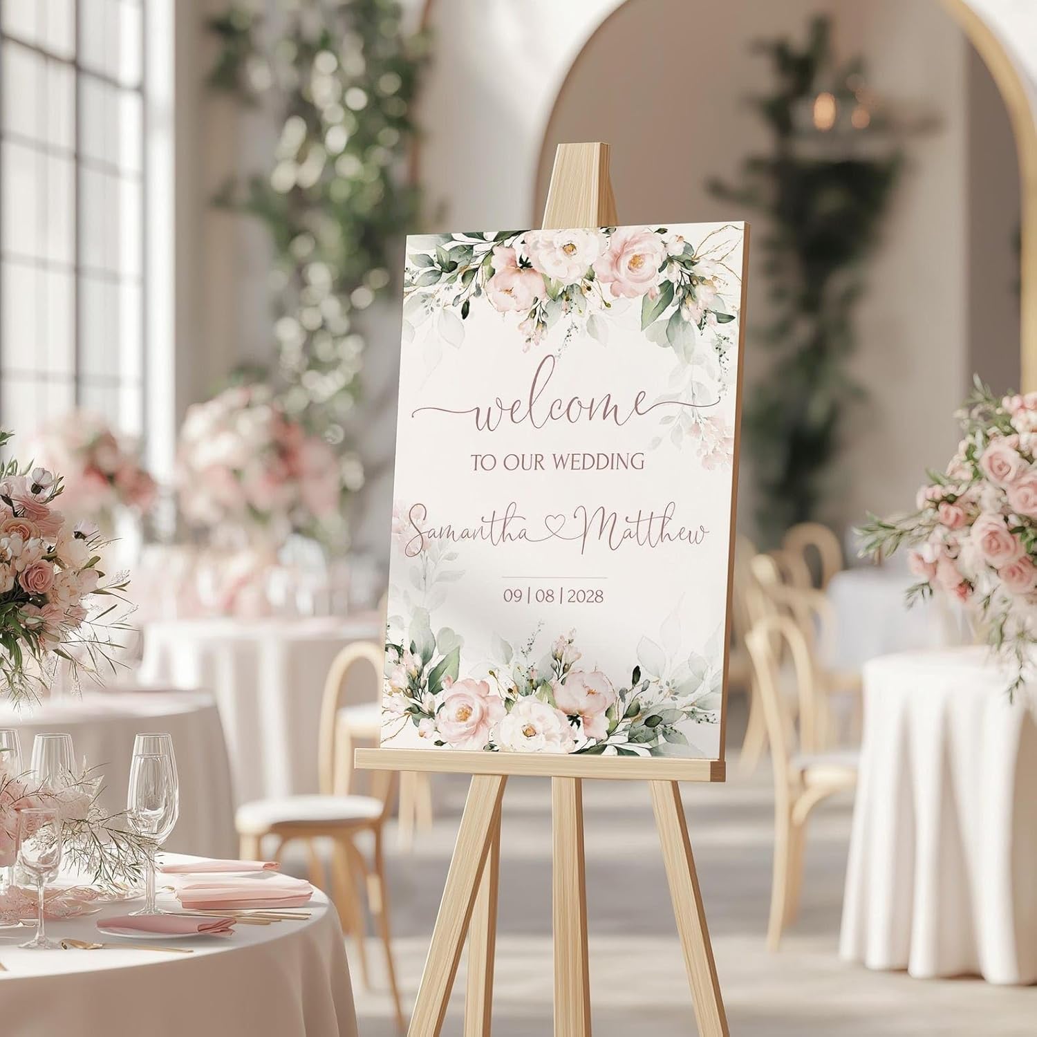 Personalized Wedding Welcome Sign, Blush Pink Floral Wedding Sign Signage 12" X 18" (Small), 27" (Medium), 36" (Large), Plastic, Modern, Pole Mount, Weather