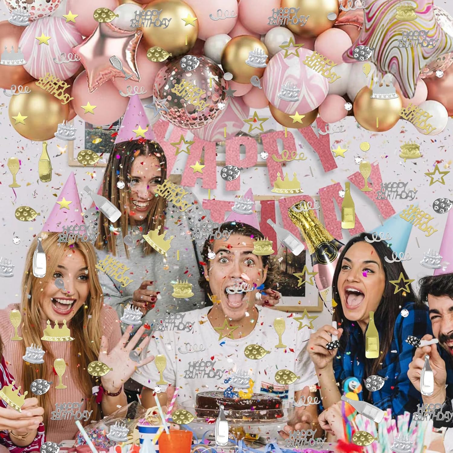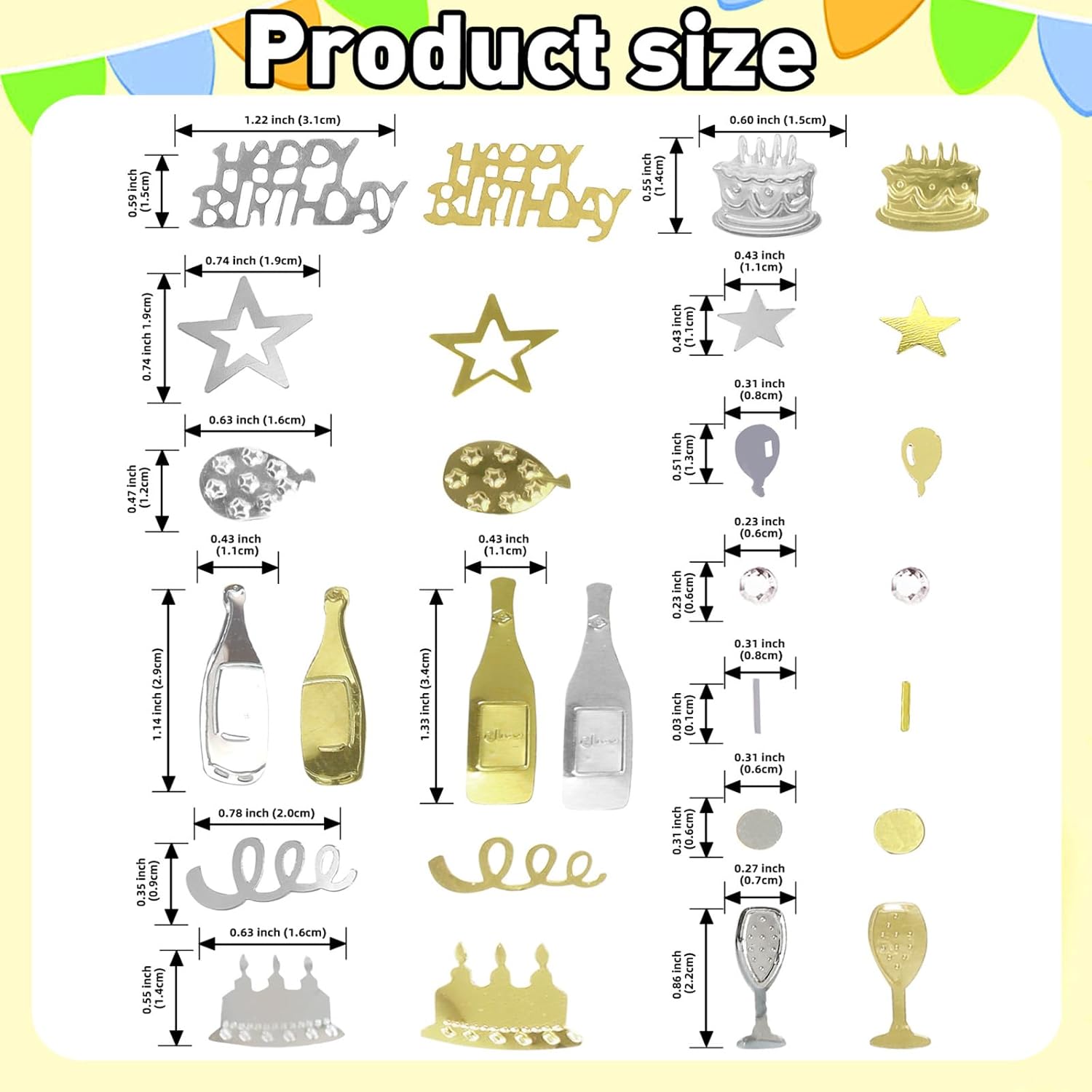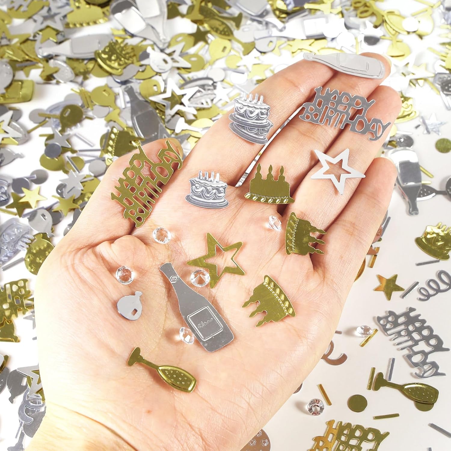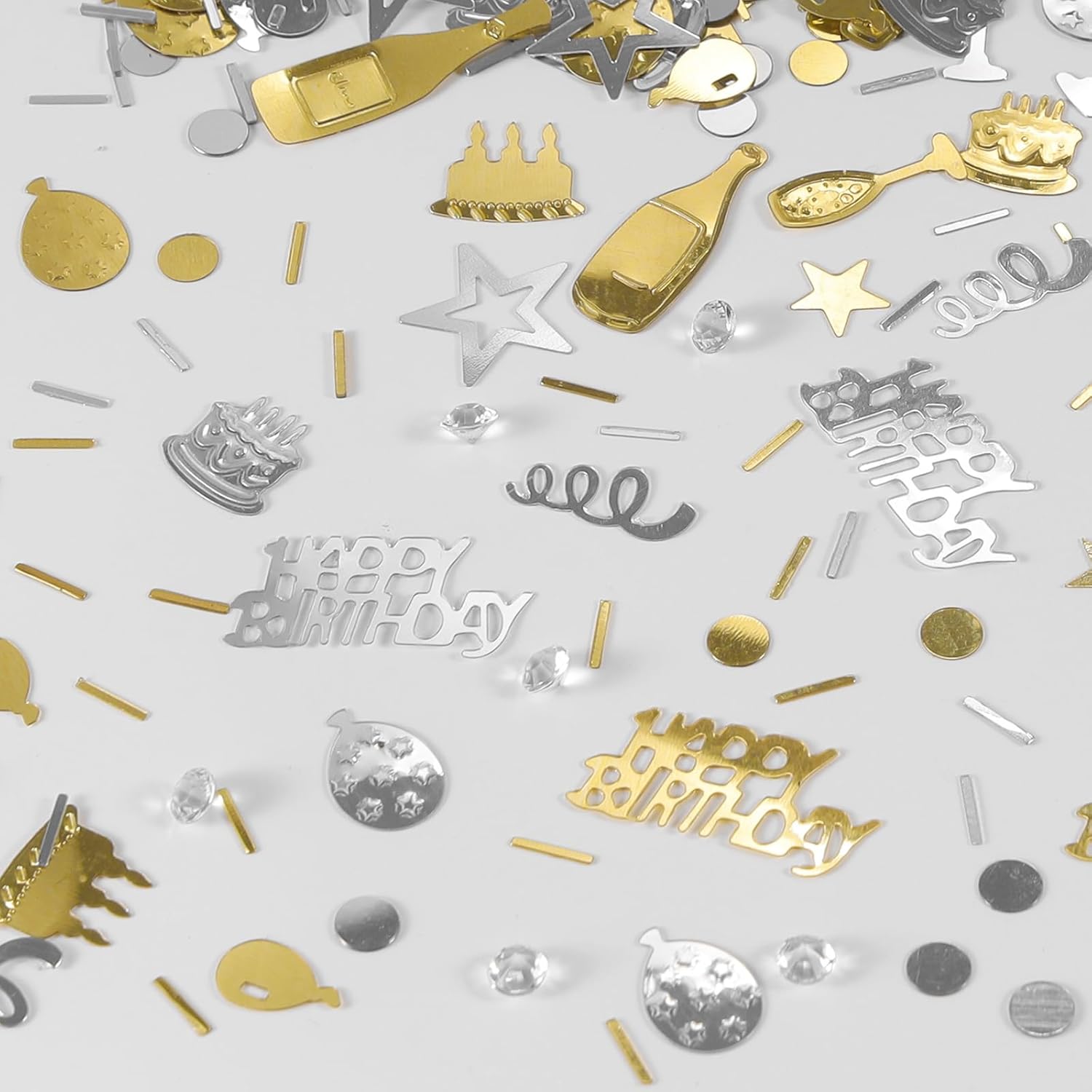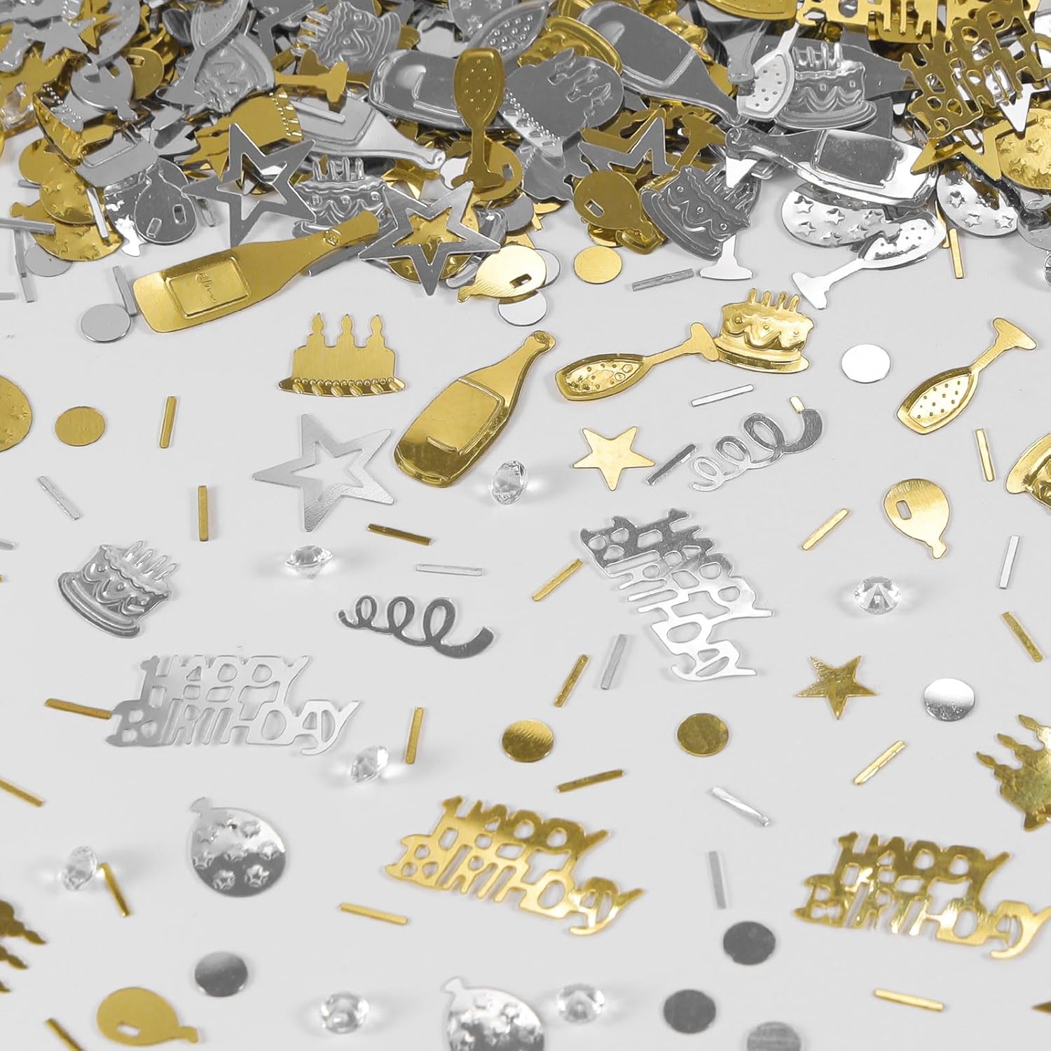 - Package Include: Happy birthday confetti 1.6 oz / 45 g, champagne gold and silver, 8 shapes, the sufficient quantity will meet your birthday party decorations