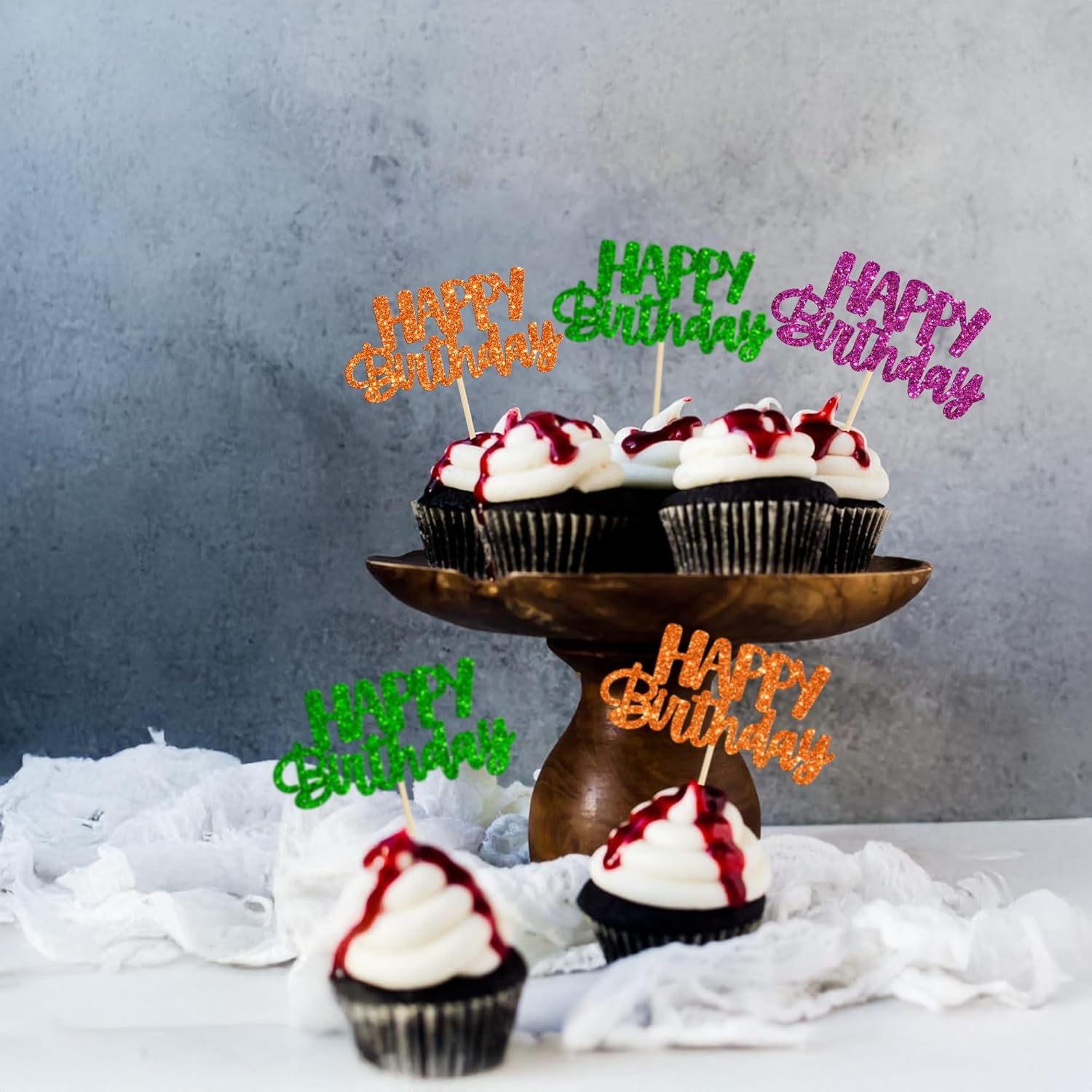 Gyufise 24Pcs Happy Birthday Cupcake Toppers Glitter Birthday Cupcake Food Picks for Celebrating Happy Halloween Theme Party Cake Decorations Supplies Orange Green Purple