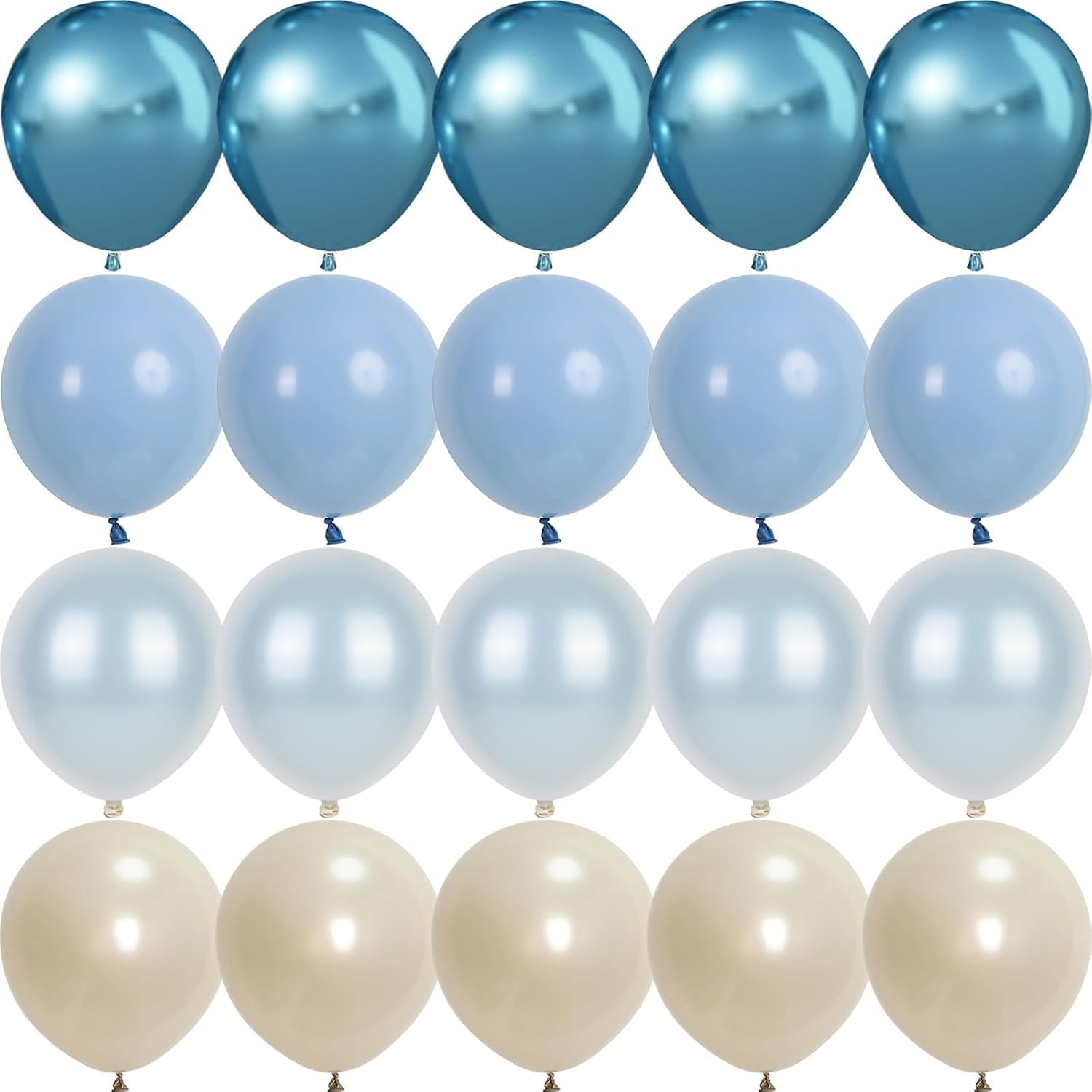 - Dusty Blue Balloon Set: You will get 10 pcs metallic blue balloons, 10 pcs double stuffed pastel blue balloons, 15 pcs dusty blue balloons, 15 pcs pearl sand white balloons, and 1 pc ribbon. This balloons blue and white kit is perfect for creating elegant balloon garlands or simple bunches.
