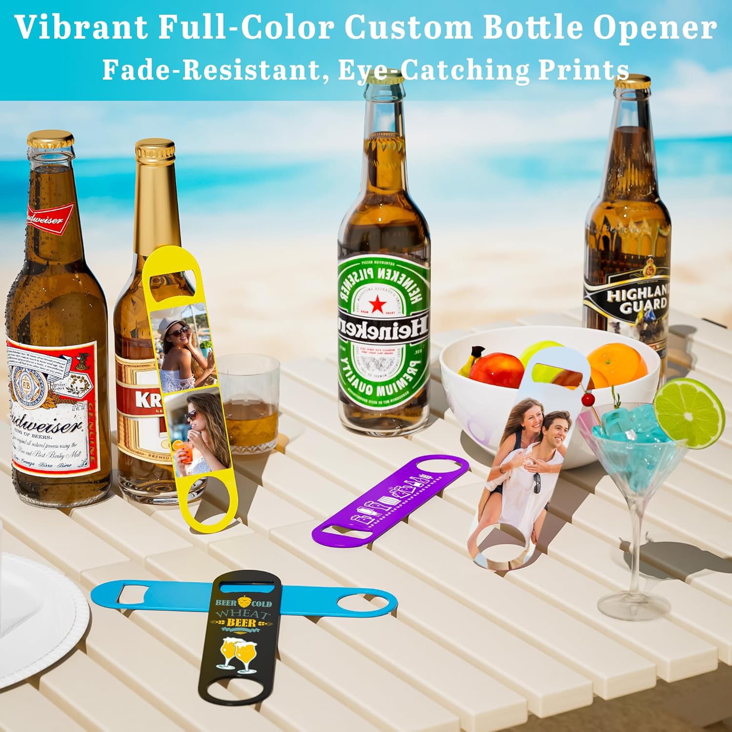 - Full-Size Customization for Branding & Personalization: This customizable bottle opener comes with vibrant double-sided full-color UV printing that are clear and durable. Add logos, text, photos, etc. Choose 7 base colors (white, Black, Purple, Blue, Yellow, Pink, Silver) for brand/event/style, ideal as unique keepsakes or promo items